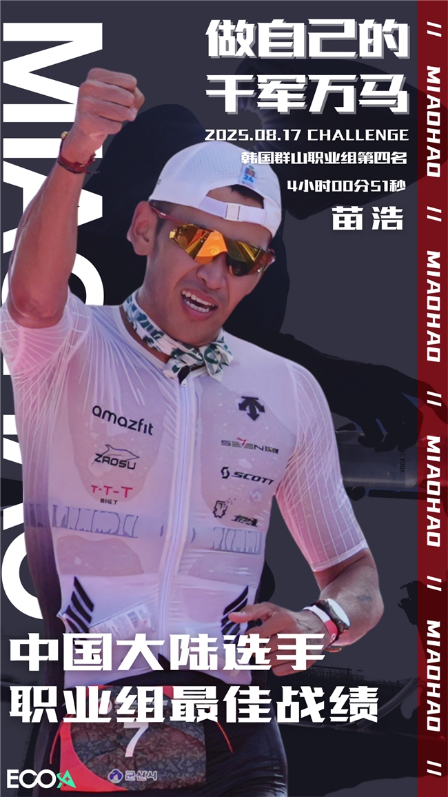 群山的海风会散去,但是中国当地高温高湿的天气,中国首位职业铁人三项运动员苗浩以4小时00分51秒的大陆成绩在Challenge(国际铁三挑战系列)职业组韩国群山站冲线,领奖台的铁职争夺从一开始就注定白热化。